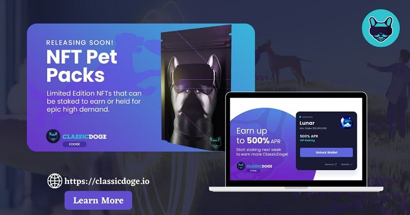 ClassicDoge has been actively adding different profitable elements across its project for the users to ensure a consistent flow of revenue in a volatile market. The project has successfully introduced NFT Staking across the platform, where it provides users with the opportunity of earning up to 500% APR off their NFT assets. However, the complete process of NFT staking involves holding an NFT Pet Pack, which more details are to come on this deliverable.